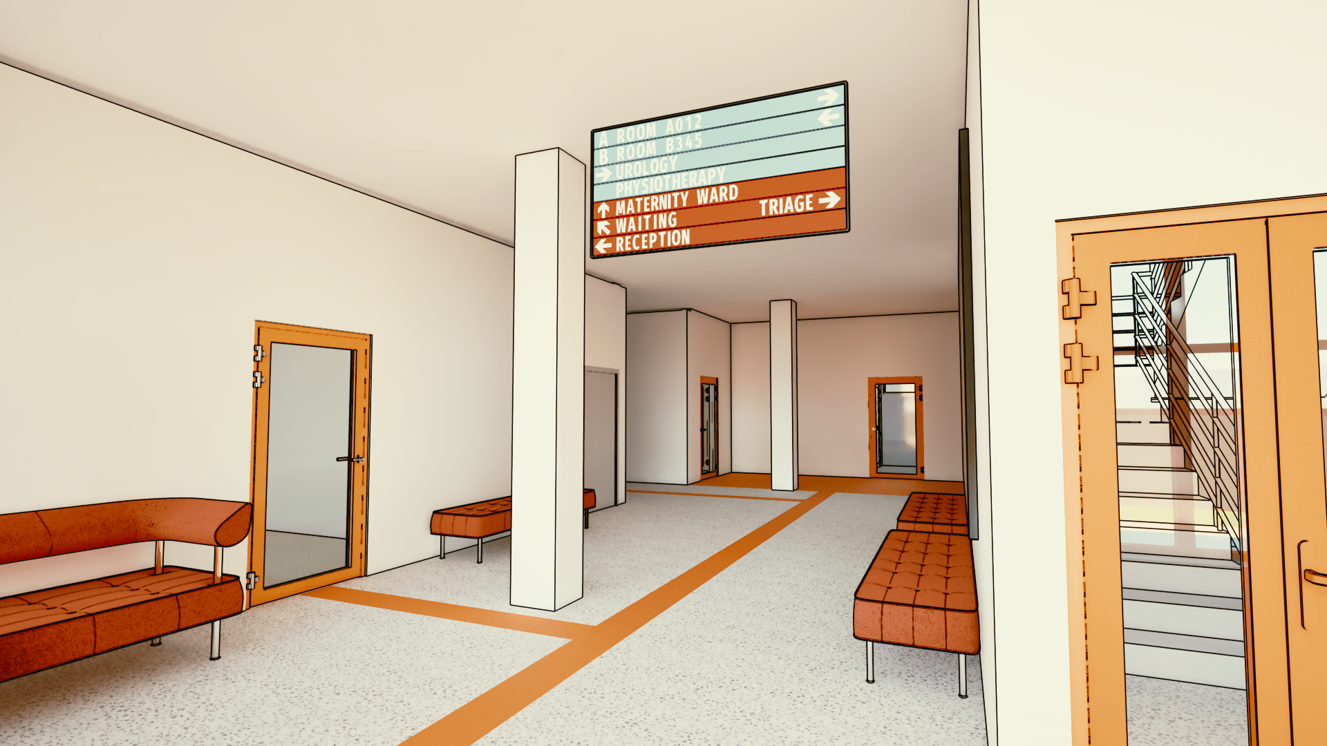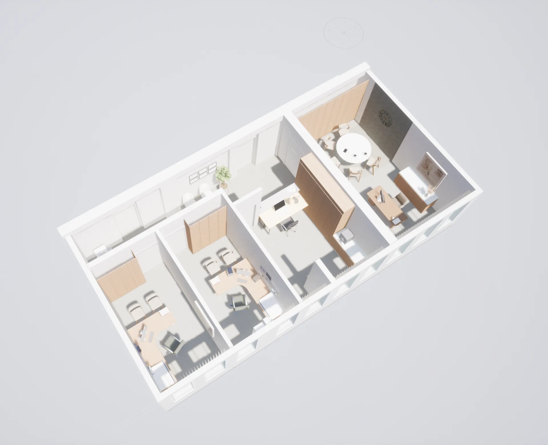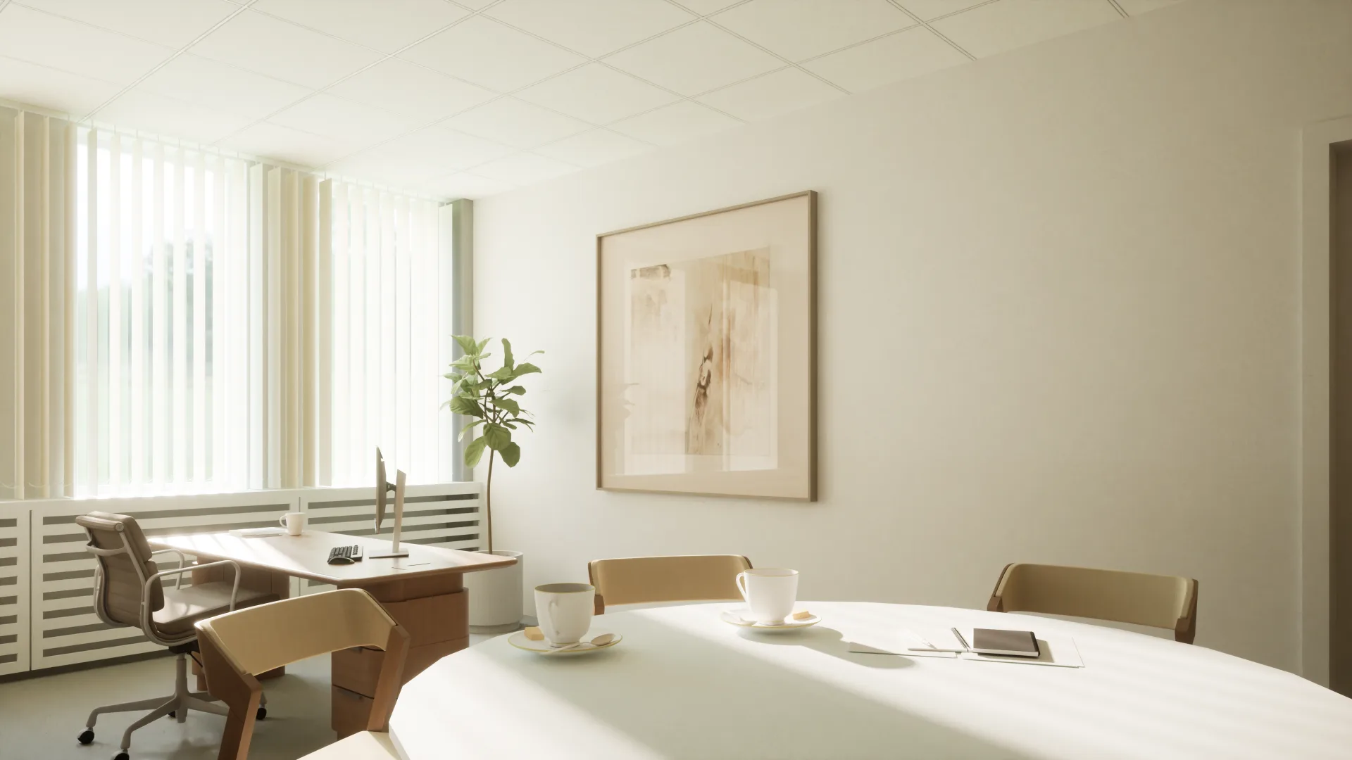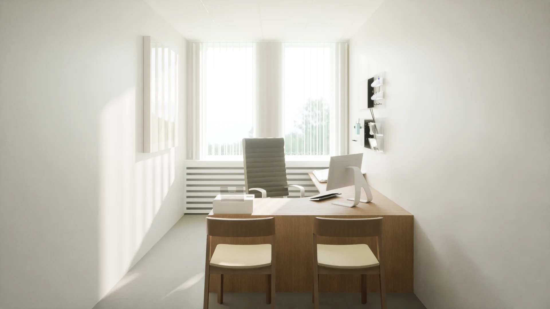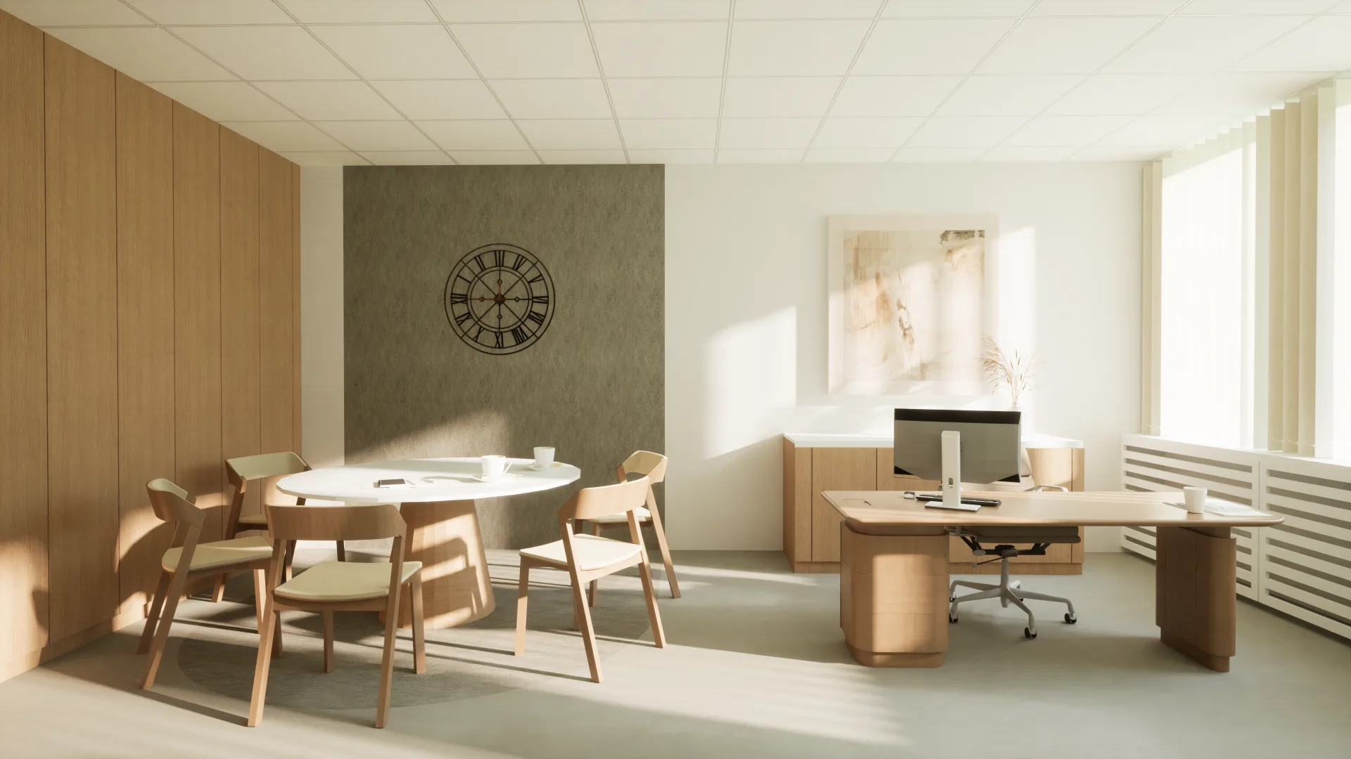 Koncepcja aranżacji pomieszczeń w budynku biurowym na nowoczesny gabinet z wydzieloną częścią administracyjną. Wnętrza utrzymane zostały w jasnych, pastelowych odcieniach, które podkreślają lekkość przestrzeni i sprzyjają komfortowi użytkowników. Duże okna zapewniają naturalne doświetlenie pomieszczeń, a drewniane meble wprowadzają ciepło oraz elegancki, ponadczasowy charakter.