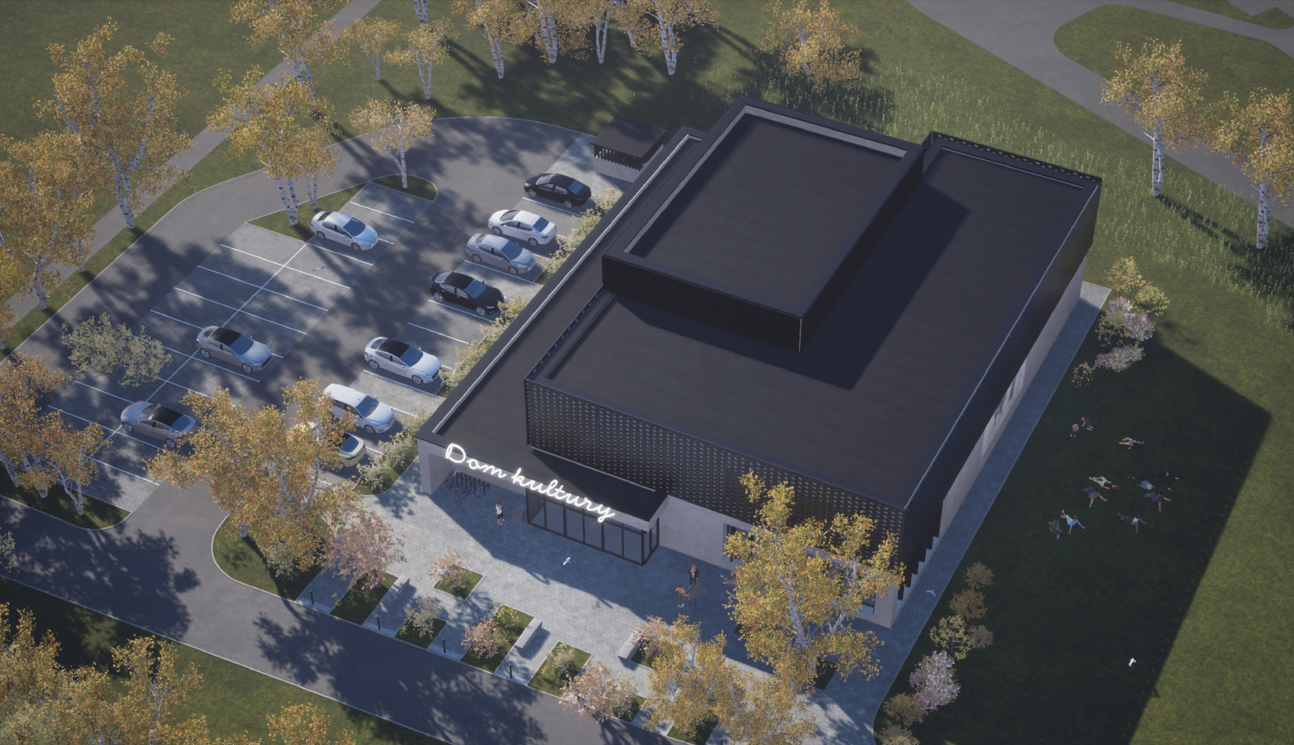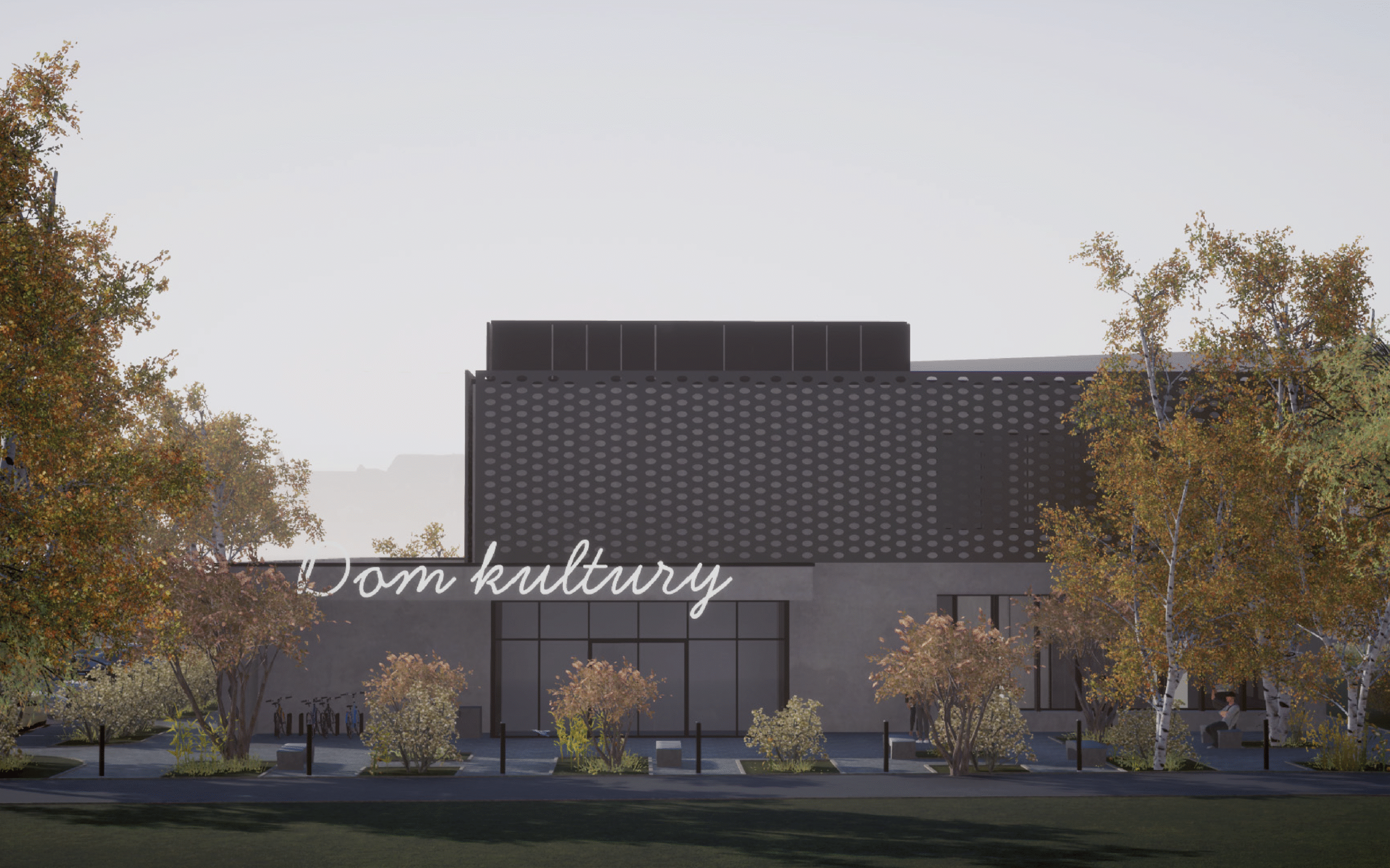 Koncepcja architektoniczna budynku zeroemisyjnego, projektowanego w oparciu o analizę nasłonecznienia, ukształtowania terenu i dominujących kierunków wiatru. W projekcie przewidziano duże przeszklenia południowe, ruchome żaluzje, instalację fotowoltaiczną o mocy 200 kW z magazynem energii oraz system wykorzystania wody deszczowej. Wszystkie przegrody zaprojektowano tak, aby spełniały standardy dla obiektów o niemal zerowym zużyciu energii. Forma budynku opiera się na zróżnicowanych wysokościach brył układających się spiralnie, co umożliwia maksymalne wykorzystanie elewacji pod panele PV i podkreśla część widowiskową obiektu. W układzie funkcjonalnym zaplanowano elastyczne sale wielofunkcyjne, studio nagrań, zaplecze sceniczne i strefy administracyjne, a całe założenie uzupełnia przemyślane zagospodarowanie terenu z podziałem na strefę wejściową, rekreacyjną i parkingową.