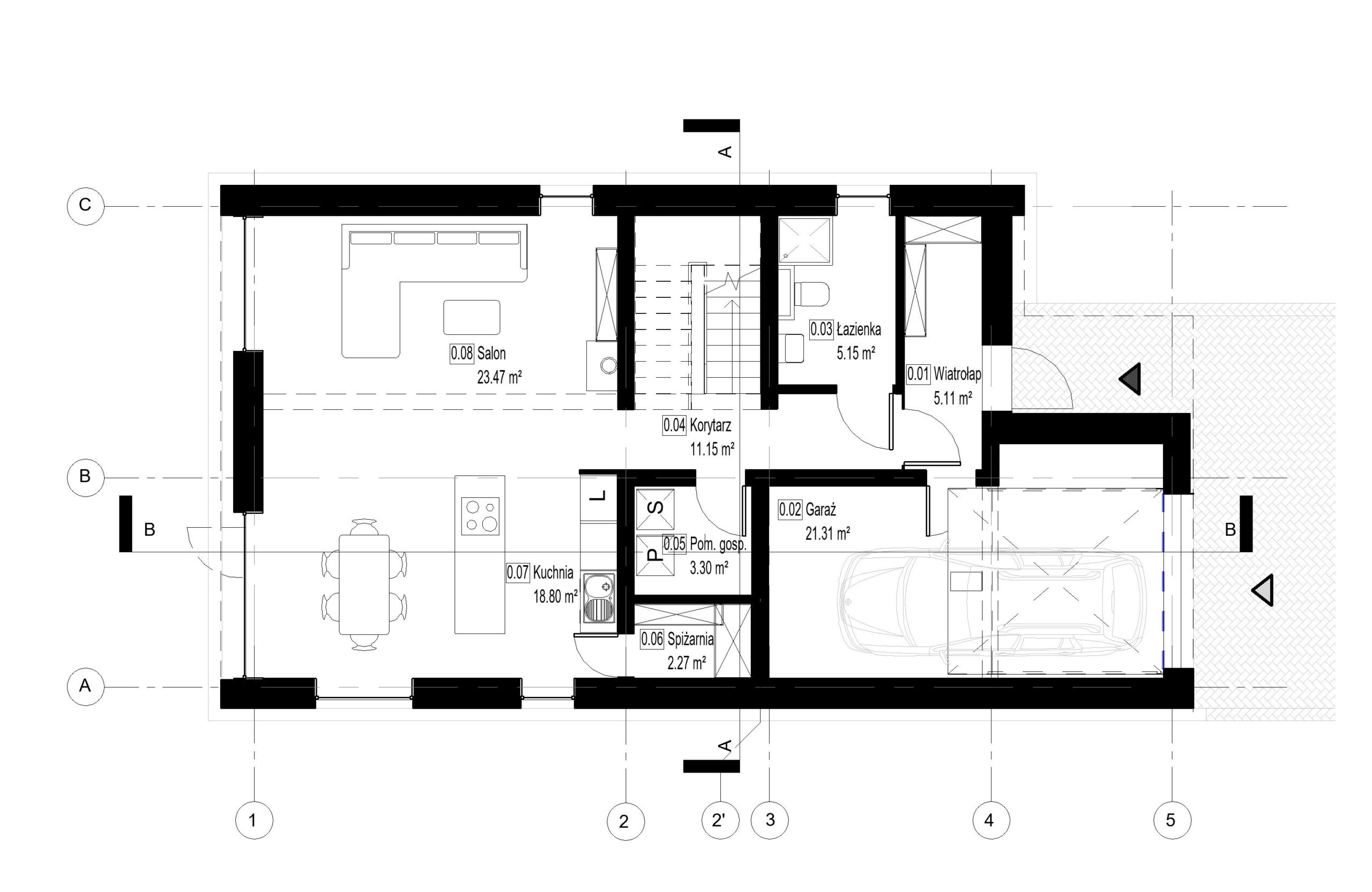 Dom o prostej, zwartej bryle na planie prostokąta z symetrycznym, dwuspadowym dachem zlokalizowany na wąskiej działce. Bryła budynku nawiązuje do tradycyjnej zabudowy domów jednorodzinnych. Fragment garażu wychodzi poza podstawowy obrys domu tworząc balkon na piętrze. Budynek posiada prosty układ wewnątrz – strefa dzienna i gościnna znajdują się na parterze a strefa prywatna z sypialniami na piętrze. Salon został otwarty na dwie kondygnacje.